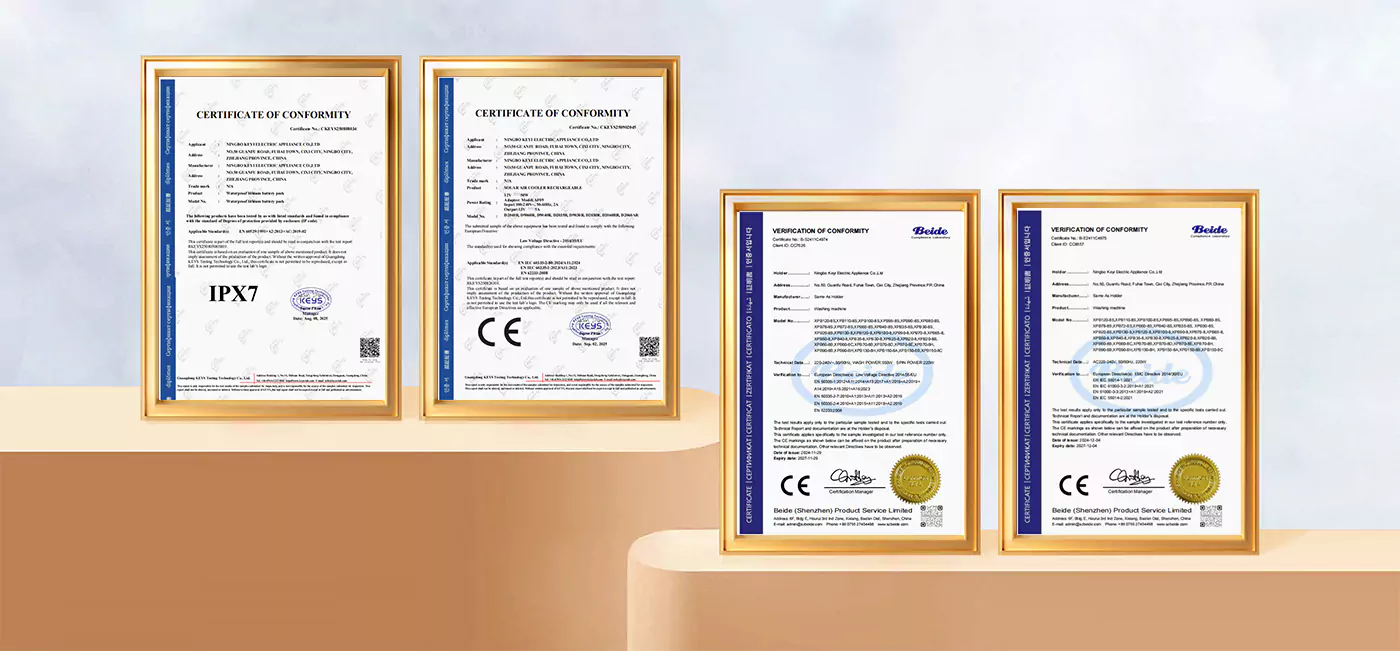Nos machines à laver et refroidisseurs d'air ont passé les normes de test de l'UE et obtenu la certification CE. La batterie bénéficie d’un indice d’étanchéité IPX7. Nous sommes également certifiés vendeur exceptionnel sur les plateformes de commerce électronique nationales et sur Alibaba.